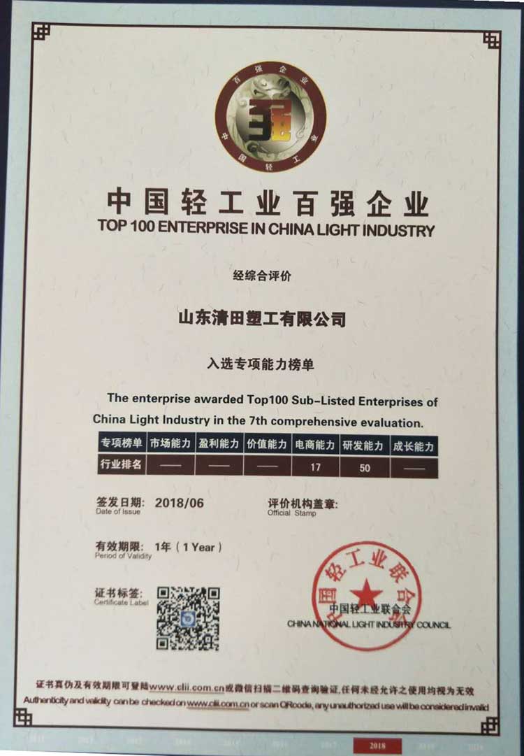 會上由中國輕工業(yè)聯(lián)合會張崇和會長做了“引領(lǐng)輕工高質(zhì)量發(fā)展,服務(wù)人民美好生活”的主題報告,并發(fā)布了2017年度中國輕工業(yè)百強企業(yè)綜合能力及專項能力榜單。山東清田塑工有限公司憑借實力雄厚的“研發(fā)能力”和“電子商務(wù)平臺運作實力”入選中國輕工百強企業(yè)專項能力榜單。