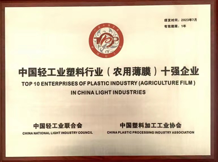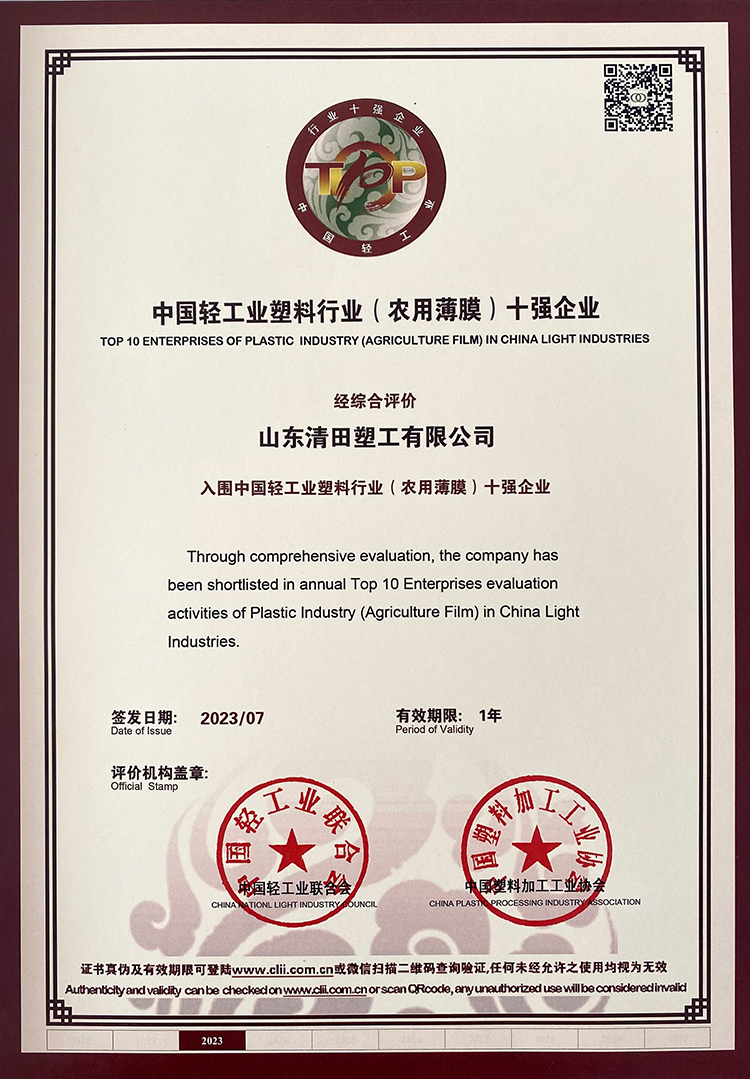 近期,清田塑工經(jīng)中國(guó)輕工業(yè)聯(lián)合會(huì)、中國(guó)塑料加工工業(yè)協(xié)會(huì)綜合評(píng)定,被授予2022年度中國(guó)輕工業(yè)塑料行業(yè)(農(nóng)用薄膜)十強(qiáng)企業(yè)榮譽(yù)稱號(hào)!